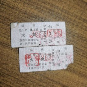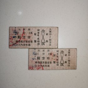 硬卡火车票•太原东 经(忻)至 阳方口•硬座全价3.5元•两张(太原东站位于山西省太原市杏花岭区的铁路车站,始建于1933年,原名太原总站,先后更名为太原北站1940年、太原东站1959年。阳方口火车站,位于山西省忻州市宁武县阳方口镇,隶属于中国铁路太原局集团有限公司,为三等站。该站始建于1937年。)