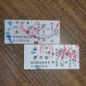 硬卡火车票•大同 至 罗文皂•罗文皂 至 大同•全价1.4元•两张(中国铁路车站:罗文皂站位于山西省大同市阳高县罗文皂镇,隶属中国铁路太原局集团有限公司管辖,为京包铁路四等站,该站始建于1911年。大同站始建于1914年,时为京包铁路和北同蒲铁路的交会点,建站初期仅有9股道历经1959年、1980年、1989年三次改造,于2015年6月14日四次扩建完成。至2006年1月,大同站站台为7台48线)