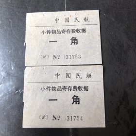 早期中国民航小件物品奇存费收据一角连号2张(沪)