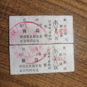 硬卡火车票•襄汾 至 侯马•侯马 至 襄汾•全价0.6元•两张(襄汾站位于山西省临汾市襄汾县车站街1号,隶属于中国铁路太原局,为同蒲铁路上的三等站,建于1935年。侯马站位于山西省侯马市路东街道新田路1号,始建于1935年同蒲铁路南段竣工时,1949年划归临汾铁路分局管辖。1958年完成侯马至河津支线建设并投入运营,1985年侯西铁路全线贯通后客货业务大幅增加。2005年划属太原铁路局。)