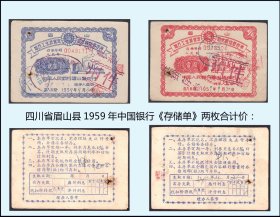 四川省眉山县1959年中国银行《投资存储单》两枚合计价:品种漂亮(19-20)。