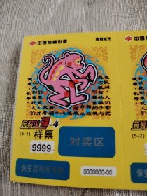 中国福利彩票样票,一套5张,面值2元,金猴送福图案,品相完好。样票主要用于展示彩票号码选择方式和投注规则,不具有兑奖价值。每张尺寸5×7.5厘米,成色如图所示。 适合收藏或展示,有兴趣的朋友欢迎留言咨询!