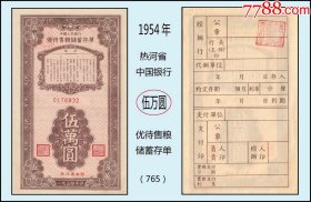 热河省中国银行1954年《优待售粮存单-伍万圆》:品相漂亮(51-52-765)