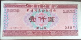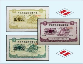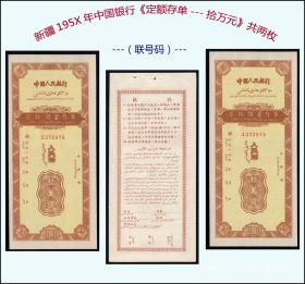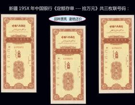 新疆195X年中国银行《定额存单--拾万元》共三枚联号码:品相漂亮(17-18)