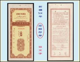 新疆195X年中国银行《定额存单》三枚价:双文字。稀缺品种(17-18-691)