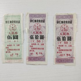 1979年北京市侨汇物资供应证(侨汇人民币)5元、50元、50元 (3张合售) 包老