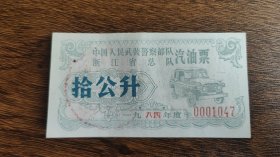 1984年中国人民解放军武装警察部队总队后勤部汽油票拾公升,84年浙江省总队油票