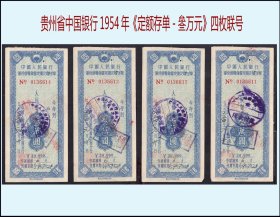 贵州省中国银行1954年《定额存单--叁万元》四枚联号:稀缺品种(19-20)