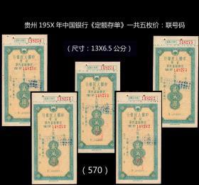 贵州省中国195X年中国银行《定额存单》五枚联号码:(17-18)--570。