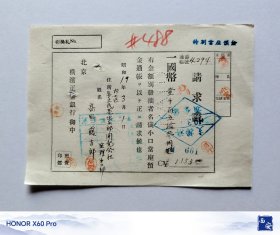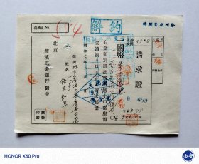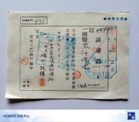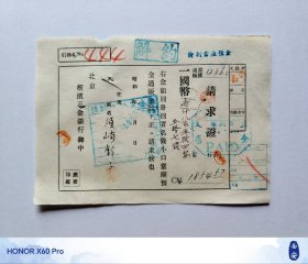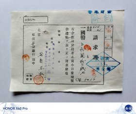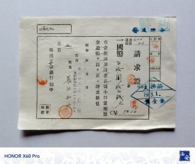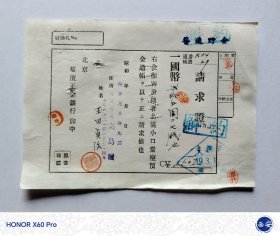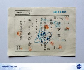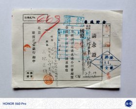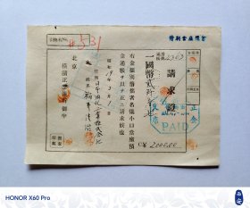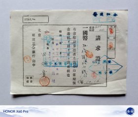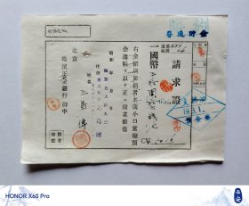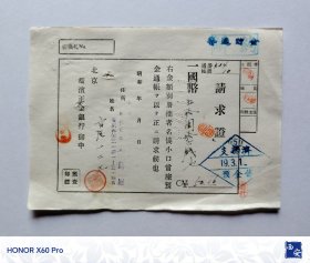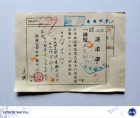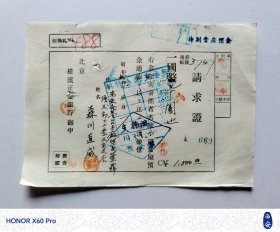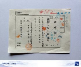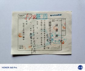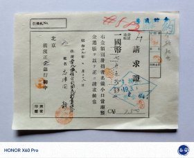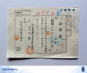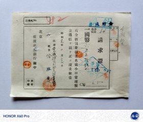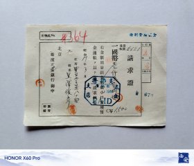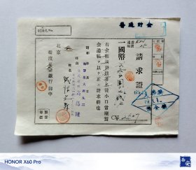 【4363】1944年日本油化工业株式会社稻井清治签名、钤印《横滨正金银行御中·国币请求证》支票凭证1张,自然旧,有装订孔,具体品相如图。