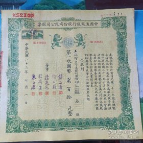 民国23年,中国通商银行股份有限公司股票。登记号数675。股票编号000581,第一次国币二百元整,高31厘米,宽32厘米,不包退,看好再下手。一定要看好再下手免得退货。有不明白的地方请咨询(FZP)
