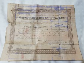 民国珍品老股票、名人“杨元恺”持股股票“1941年中国金属股份有限公司老股票”一张,持股人为著名圣约翰大学留洋高材生“杨元恺”先生,其妻是民国“玫瑰小姐葛璐茜(葛维宗)”、其女为香港近现代著名演员“夏梦”小姐,介绍仅供参考,具体自鉴,