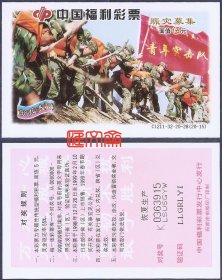 抗洪彩票收藏:中国福利彩票-C1211-32-20-28【98抗洪赈灾募集】(20-15)青年突击队大江筑堤,票背“恢复生产”。石家庄市胶印厂印刷