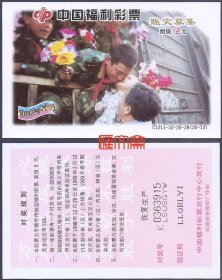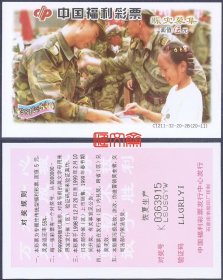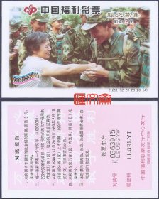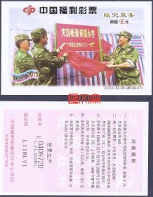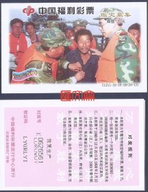 抗洪彩票收藏:中国福利彩票-C1211-32-20-28【98抗洪(13)赈灾募集】(20-13)灾区娃娃和解放军叔叔亲吻,票背“恢复生产”。石家庄市胶印厂印刷