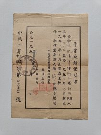 1952年中国职业补习学校二校学业成绩证明书