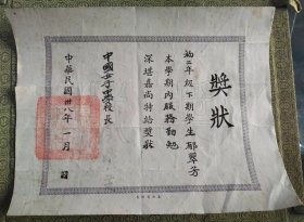 民国三十八年中国女子中学奖状