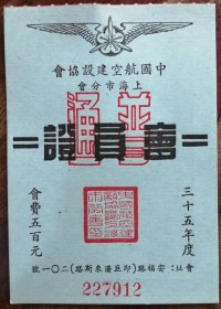 民国35年《中国航空建设协会上海分会会员证即五百元会费》一枚,品相看图!