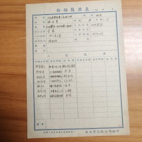 华北军区史料,1949年亲笔填写。谢同英(1919-)江西省赣县人。1931年参加中国工农红军。1939年加入中国共产党。土地革命战争时期,任红一方面军五师16团警卫员、司号员、卫生员,红三军团保卫局科员。参加了长征。解放战争时期,河北省军区邯郸军分区卫生科长。建国后,任志愿军543医院院长,西藏军区野战第三医院院长,101野战医院院长,北京军区后勤部直供部副部长,军区后勤部司令部顾问。
