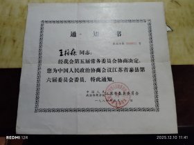 中国人民政治协商会议江苏省泰县委员会通知书