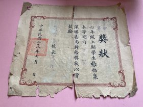 民国38年,上海市私立正德小学,甲等奖状证书, 红印,校长 沈造新,钤印(中华民国三十八年七月 上海解放刚刚一个多月,新中国还未建国。过渡时期的解放区证书。稀有!罕见!)