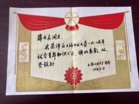 1985年上海工业大学团委颁发的“优秀青年知识分子”奖状,薛求真同志,80年代美国埃默里大学电子医疗教授(清华大学毕业)。国家教委教材编审委员、中国国际贸易学会常务理事薛蕃康之子。