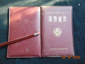 从事电影发行放映工作三十年荣誉证书-中国电影发行放映公司-安徽省委俱乐部-36开