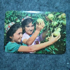 年历片-1972年:(年历卡)摘苹果【中国粮油食品进出口总公司】1张,包真包老 ,好品。