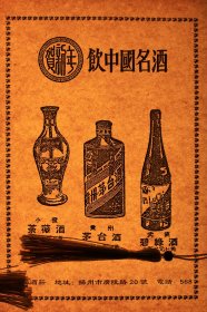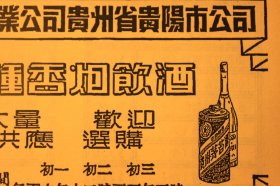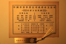 贵州茅台酒广告系列· 50年代贵州茅台酒宣传广告单页·中国专卖事业公司成都市支公司·春节大量供应名烟名酒——新华 国际 金轮 金鼠 广柑酒 邛崃茅台 甜橘酒 银行 万寿 光荣 世和 五粮液 贵州茅台 口裹酥 俄得克 腰鼓 白金龙 北京 牧羊 味美思·大瓶半打、散装五斤B2080