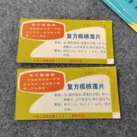 早期老药标商标:复方榄核莲片,有毛主席语录(2张合售)