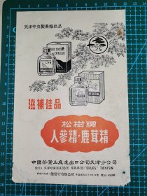 建国初50年代,香港德信行有限公司代理中国茶叶土产进出口公司天津分公司~天津中央制药厂出品:松树牌人参精.鹿茸精广告剪片(背中国山东省纺织品进出口公司:“凤凰牌”毛巾布晨衣、毛巾布沙滩装广告)