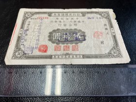 民国31年中央信托局 中国银行 交通银行联合发行伍拾圆节约建国储蓄券 盖中央信托局昆明分局条章(尺寸:16.5*11cm)