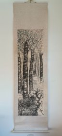 日本回流 红都逸人《水墨白桦林》(手绘)纸本立轴(008)