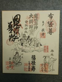 七福神,红章都为手盖,左上角毘沙门天为手写,好劲!回流色卡色纸卡版画,纸本, 纵27Cm横24Cm。
